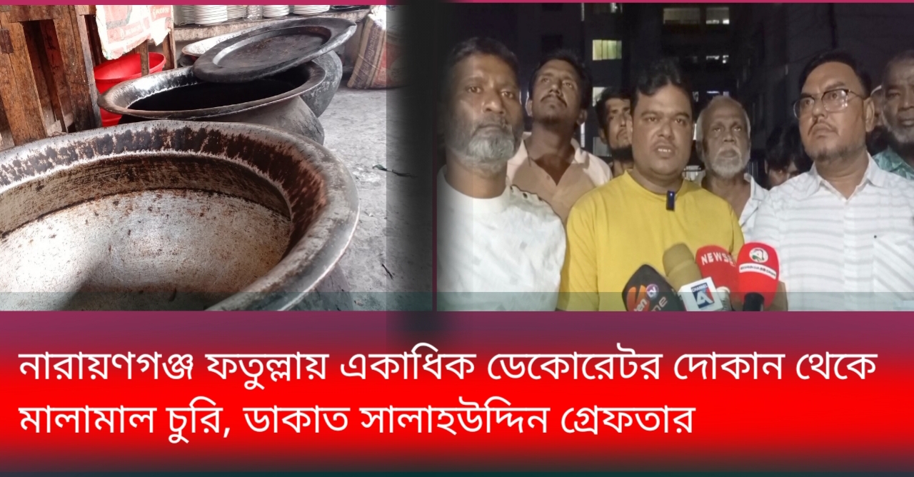 নারায়ণগঞ্জের ফতুল্লায় একাধিক ডেকোরেটর দোকান থেকে হাড়ি-পাতিলসহ বিভিন্ন মালামাল চুরি ও ডাকাতির অভিযোগে কুখ্যাত চোর সালাহউদ্দিনকে গ্রেফতার করেছে ফতুল্লা থানা পুলিশ।